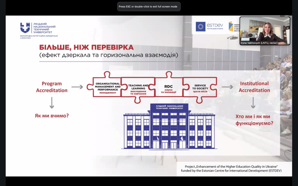 економічного університету іменіВадима Гетьмана, голова ГЕР23 «Соціальна робота»), Тетяна Фролова (начальниця навчально-методичного відділу забезпечення якості освіти та акредитації Київського національного економічного університету імені Вадима Гетьмана, член ГЕР С1 «Економіка таміжнародні економічні відносини») ІринаВахович (ректорка Луцького національного технічного університету). На вебінарі були продемонстрований позитивний досвід інституційної акредитації українських ЗВО: