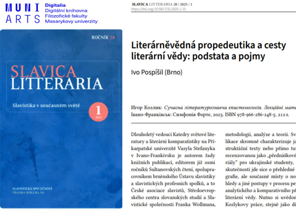 І ось нова публікація, яка нещодавно побачила світ у брненському (Чеська Республіка) часописі «Slavica litteraria» (2025, т. 28, вип. 1, с. 161–168), – чеськомовна стаття «Literárněvědná propedeutika a cesty literární vědy: podstata a pojmy» («Пропедевтика літературознавства та шляхи літературної науки: сутність і поняття») про новітні монографічні дослідження з методологічної проблематики професора КНУВС Ігоря Козлика. Автор вказаної статті – знаний у світі чеський учений-літературознавець із Університету Масарика, доктор філологічних наук, професор Іво Поспішіл.