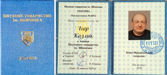 Квиток члена НТШ професору Ігорю Козлику вручив голова Івано-Франківського осередку НТШ, доктор технічних наук, професор, дійсний член НТШ, професор кафедри фізико-математичних наук Івано-Франківського національного технічного університету нафти і газу, лауреат Державної премії України в галузі науки і техніки Василь Мойсишин на весняному пленарному засіданні осередку, яке відбулося 20 березня 2026 року в Івано-Франківській обласній універсальній бібліотеці ім. І. Франка.