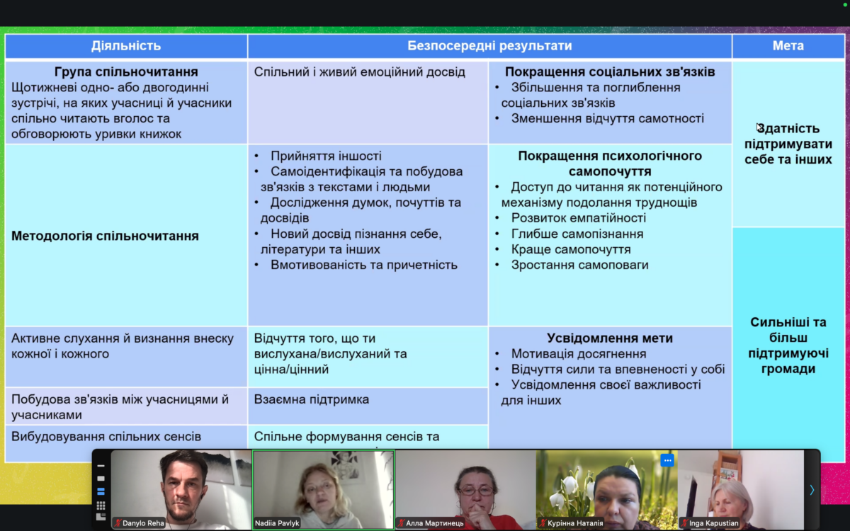 У процесі спілкування лекторка поділилася інформацією про принципи організації спільночитання у різних країнах Європи. У якості прикладу детально зупинилася на досвідові у Англії та Данії. Цікавим для слухачів виявився досвід про дослідження щодо спільночитання, яке проводиться у ряді регіонів України.