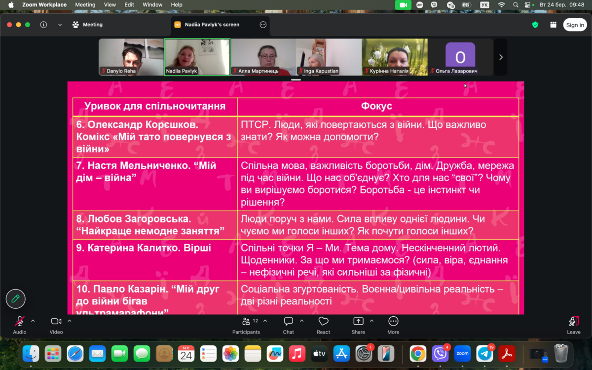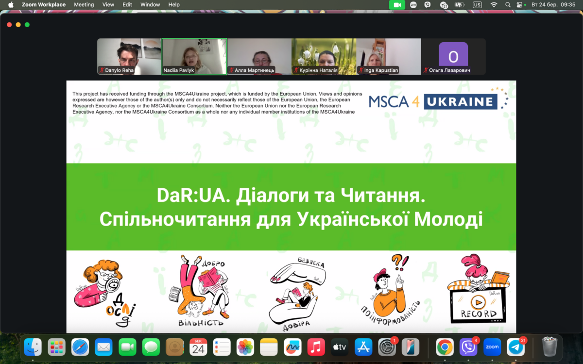 Зустріч модерувала доцентка кафедри світової літератури і порівняльного літературознавства Алла Мартинець. Серед слухачів були викладачі, аспіранти та здобувачі освіти факультету філології. До їхньої уваги була запропонована лекція «Побратими у читанні. Як спільночитання сучасної воєнної літератури об’єднує молодих людей. (За матеріалами дослідження DaR:UA “Діалоги та Читання. Спільночитання для української молоді)».