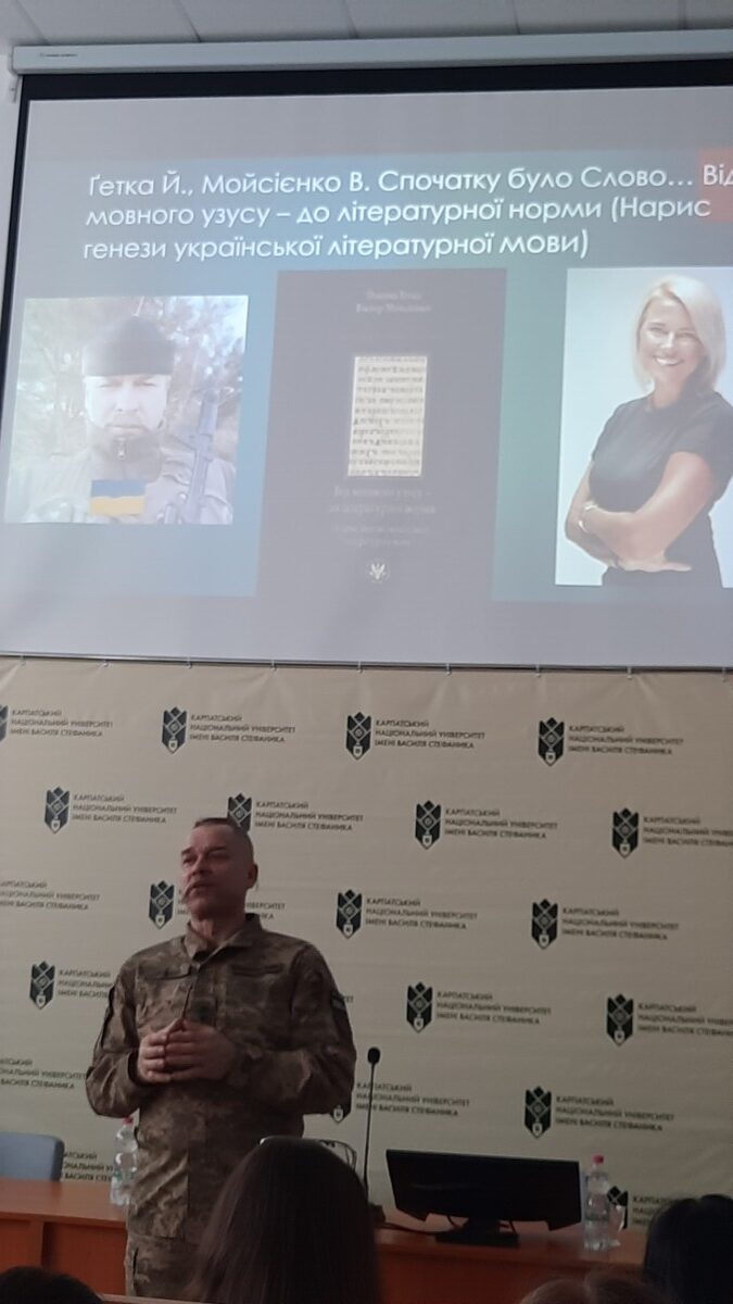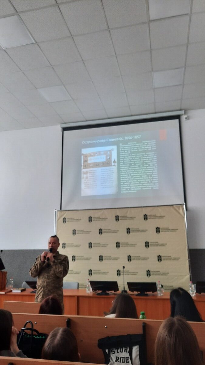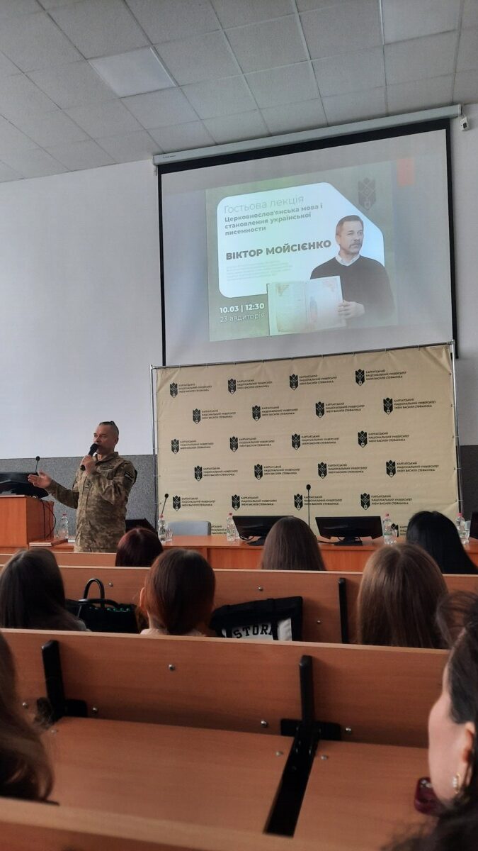 Викладачі кафедри на запрошення декана Факультет філології КНУВС професора Романа Голода побували на гостьовій лекції доктора філологічних наук, професора Житомирського державного університету імені Івана Франка, члена-кореспондента Національної академії наук України та чинного воїна Збройних Сил України Віктора Мойсієнка на тему: «Церковнослов’янська мова і становлення української писемности».