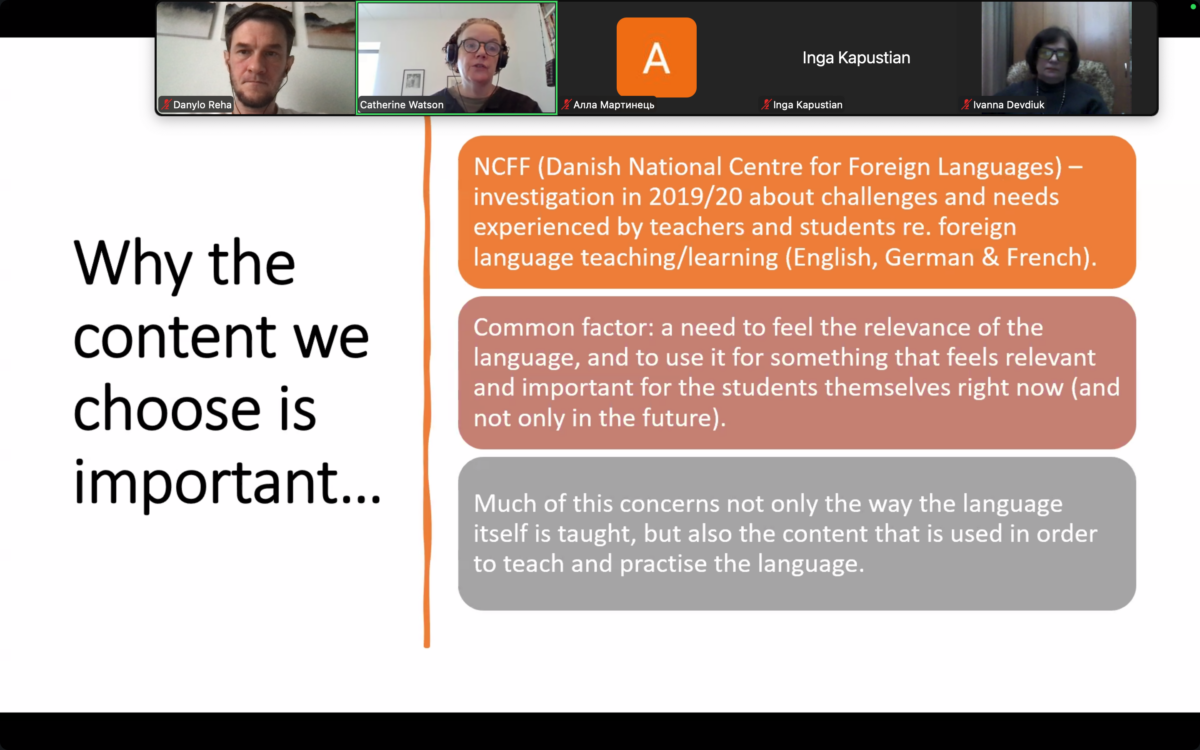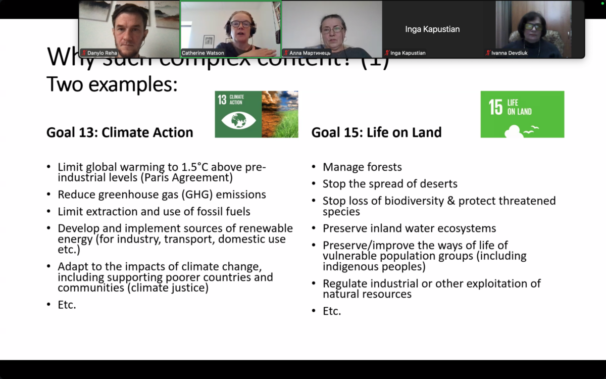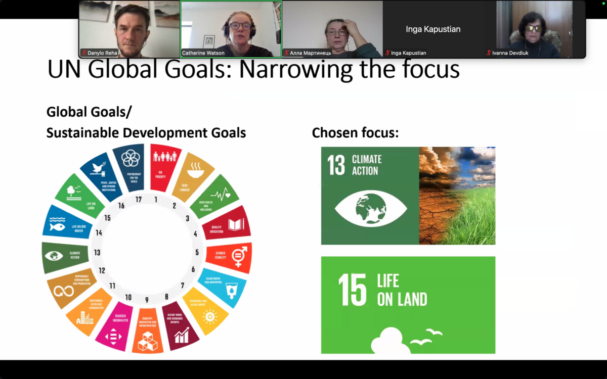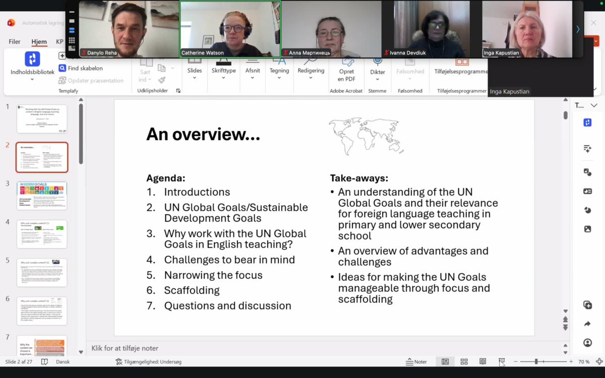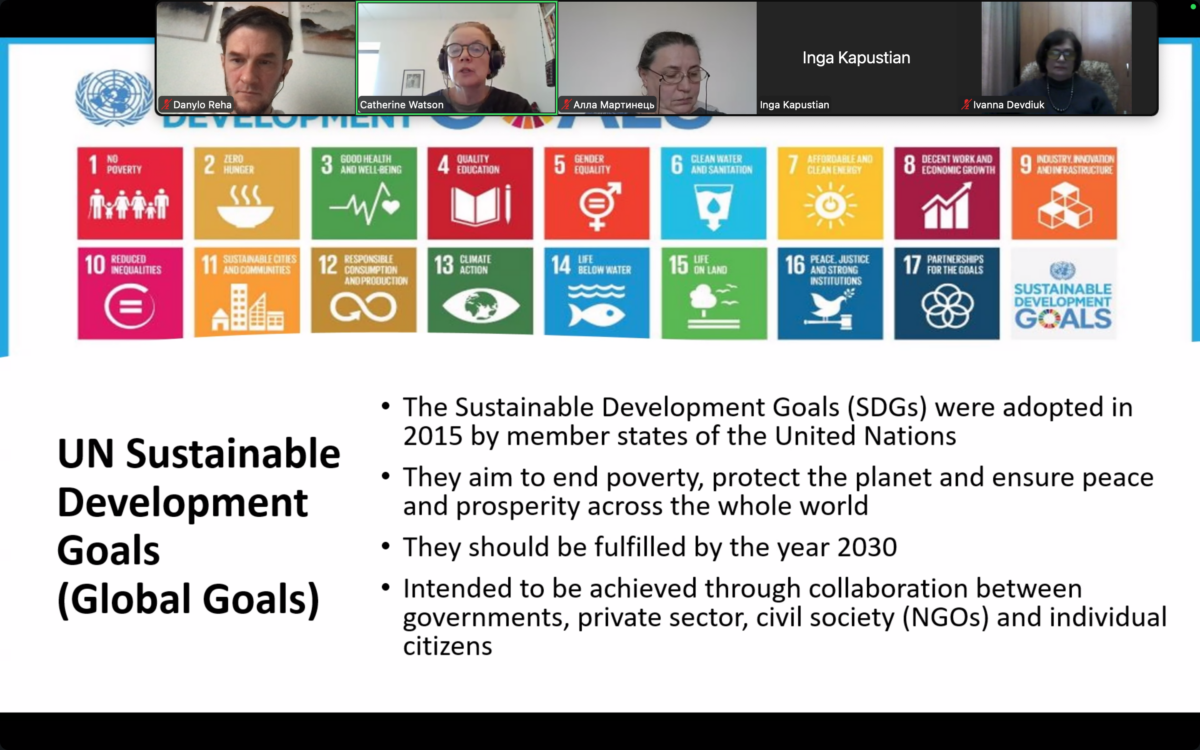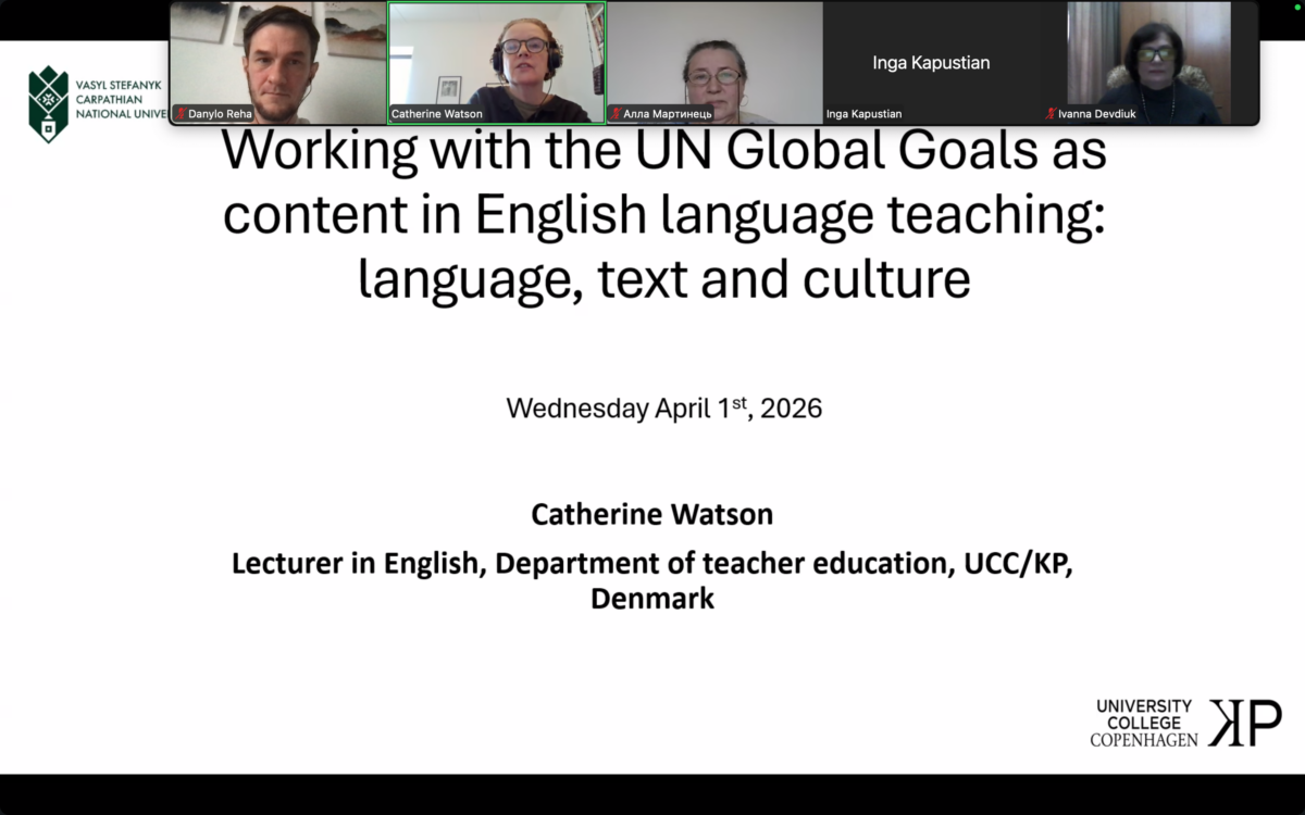 Сьогодні слухачам була запропонована тема «Ангійська мова як засіб досягнення глобальних цілей ООН через призму мови-тексту-культури». Модерувала зустріч професорка кафедри І. В. Девдюк. До зустрічі долучилися викладачі та здобувачі освіти факультету філології та факультету іноземних мов.