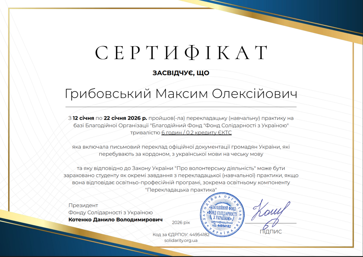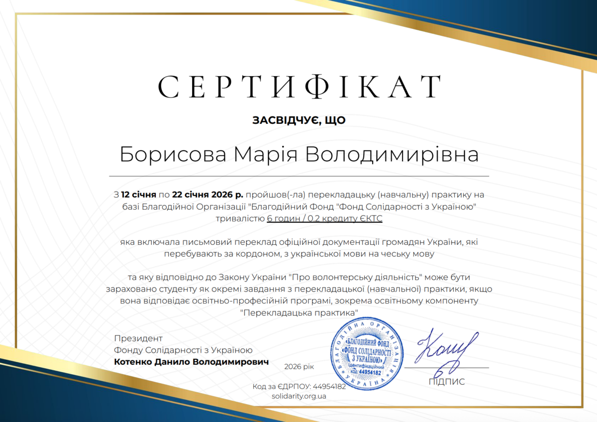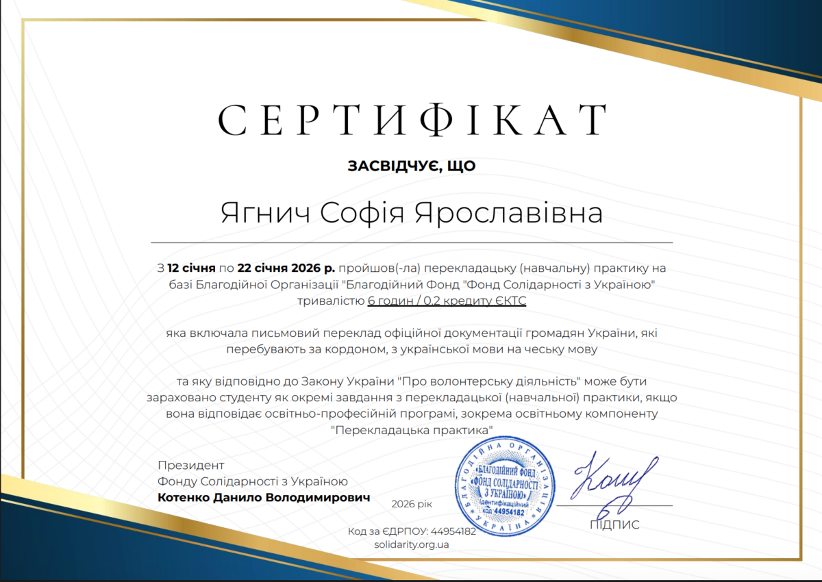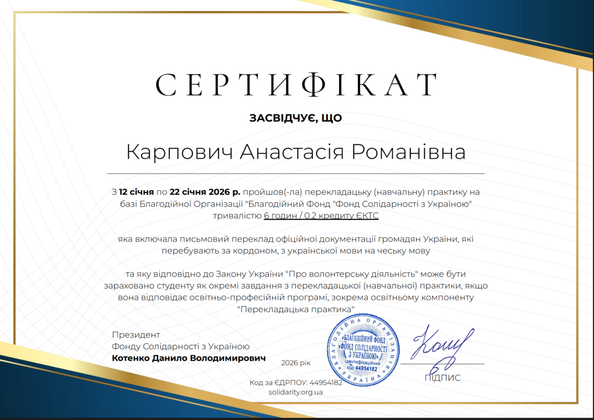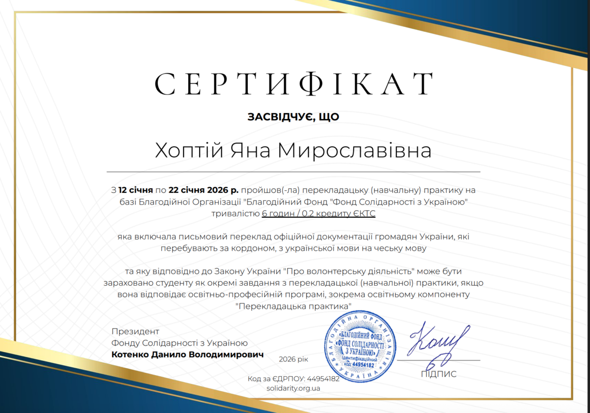 Сертифікати студентів Сертифікат Плісак В. Сертифікат Плісак В. Сертифікат Русковолошин К. Сертифікат Вишинської Д. Сертифікат Бублінської І. Сертифікат Бублінської І. Сертифікат Борисової М. Сертифікат Бублінської І. Сертифікат Русковолошин К. Сертифікат Плісак В. Список студентів через внутрішню систему Оломоуцького університету в межах програми Erasmus+ Сертифікат Копищик О. 1 2 Сертифікат Яковишак І. Сертифікат Стасинець Х. Сертифікат Паламарчук Р. Сертифікат Коліжак Р. Сертифікат Кошелі Л.